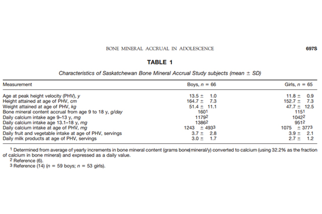 Trong hai năm tăng trưởng mạnh nhất của hệ xương, thanh thiếu niên tích tụ được trên 25% khối lượng xương của người trưởng thành. Dữ liệu của Nghiên cứu Saskatchewan cũng đã cung cấp các chỉ số sinh học về nhu cầu canxi cũng như tiết lộ công thức dinh dưỡng để đạt được khối lượng xương tối ta trong giai đoạn 2 năm tăng trưởng cao nhất của tuổi thanh thiếu niên (xem Bảng 2). Trong đó nói rõ, hai yếu tố quan trọng nhất giúp khối lượng xương và kích thước xương tăng trưởng được ở mức cao nhất là chế độ dinh dưỡng và lối sống (luyện tập và chế độ nghỉ ngơi):